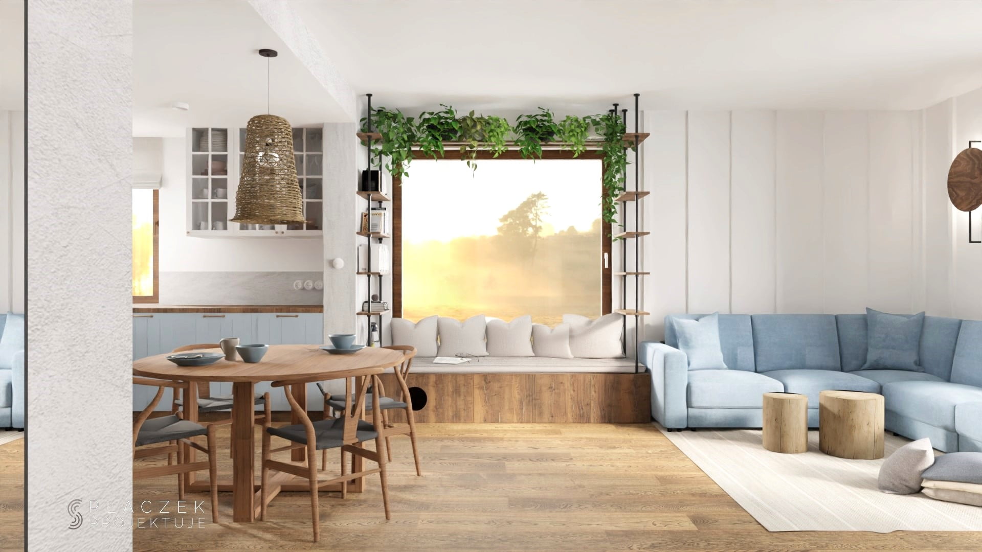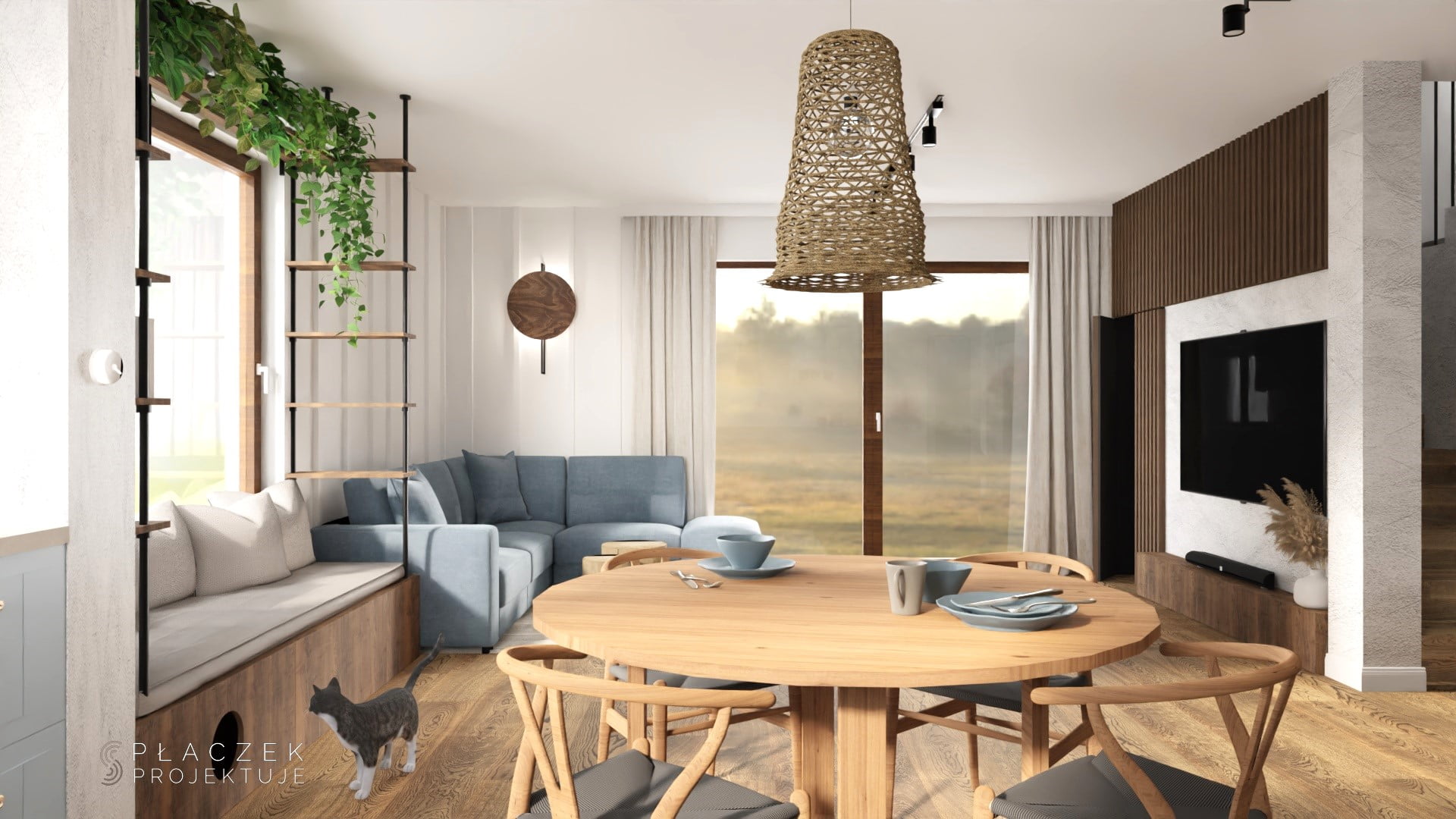 Dom wg projektu „Jabłonki” w okolicy Słupska. Projekt powstał dla młodej rodziny 2+2. Delikatnie wiejski klimat uzupełniony nowoczesnym designem i praktycznymi rozwiązaniami to kwestie najważniejsze dla właścicieli.