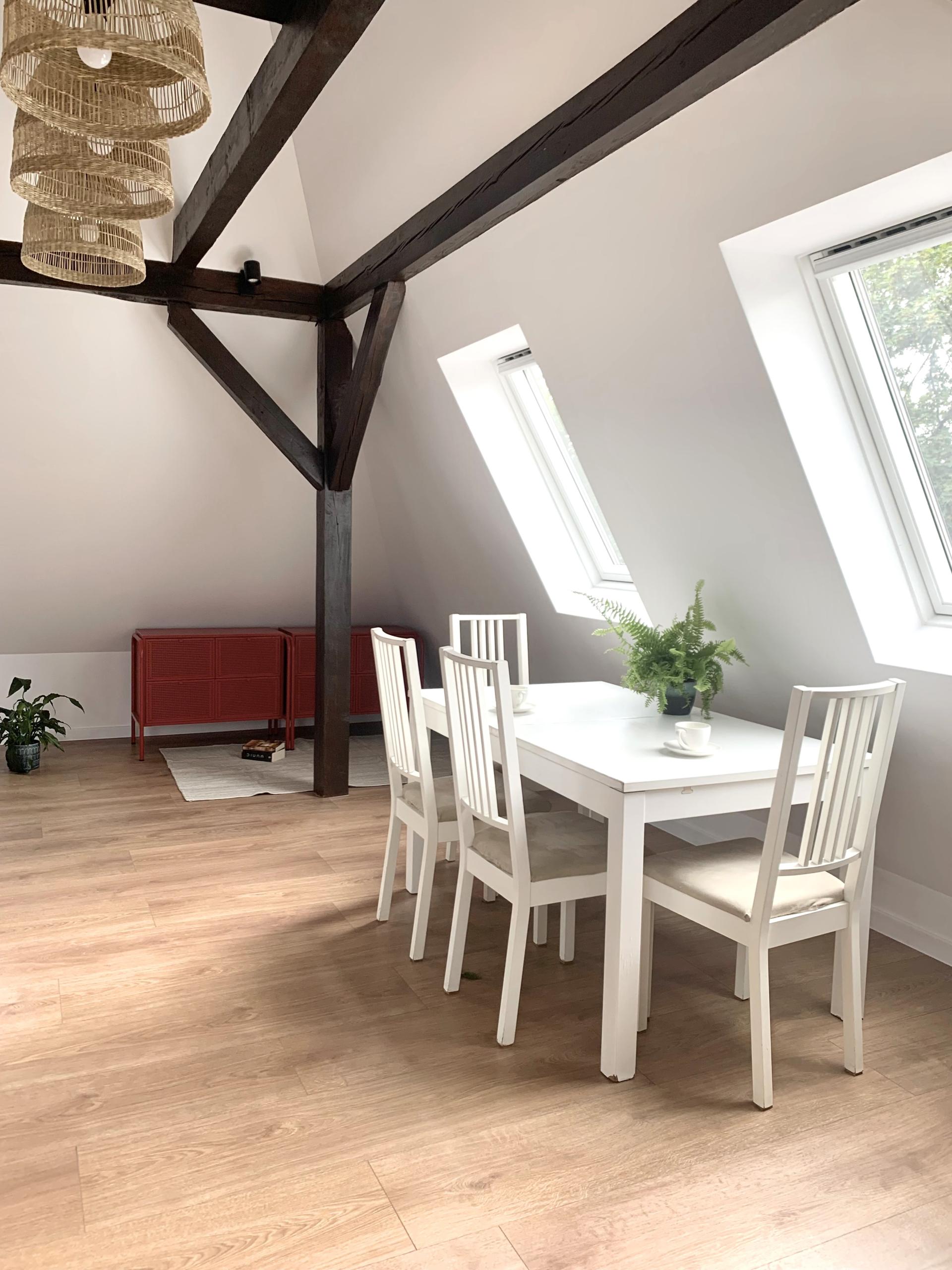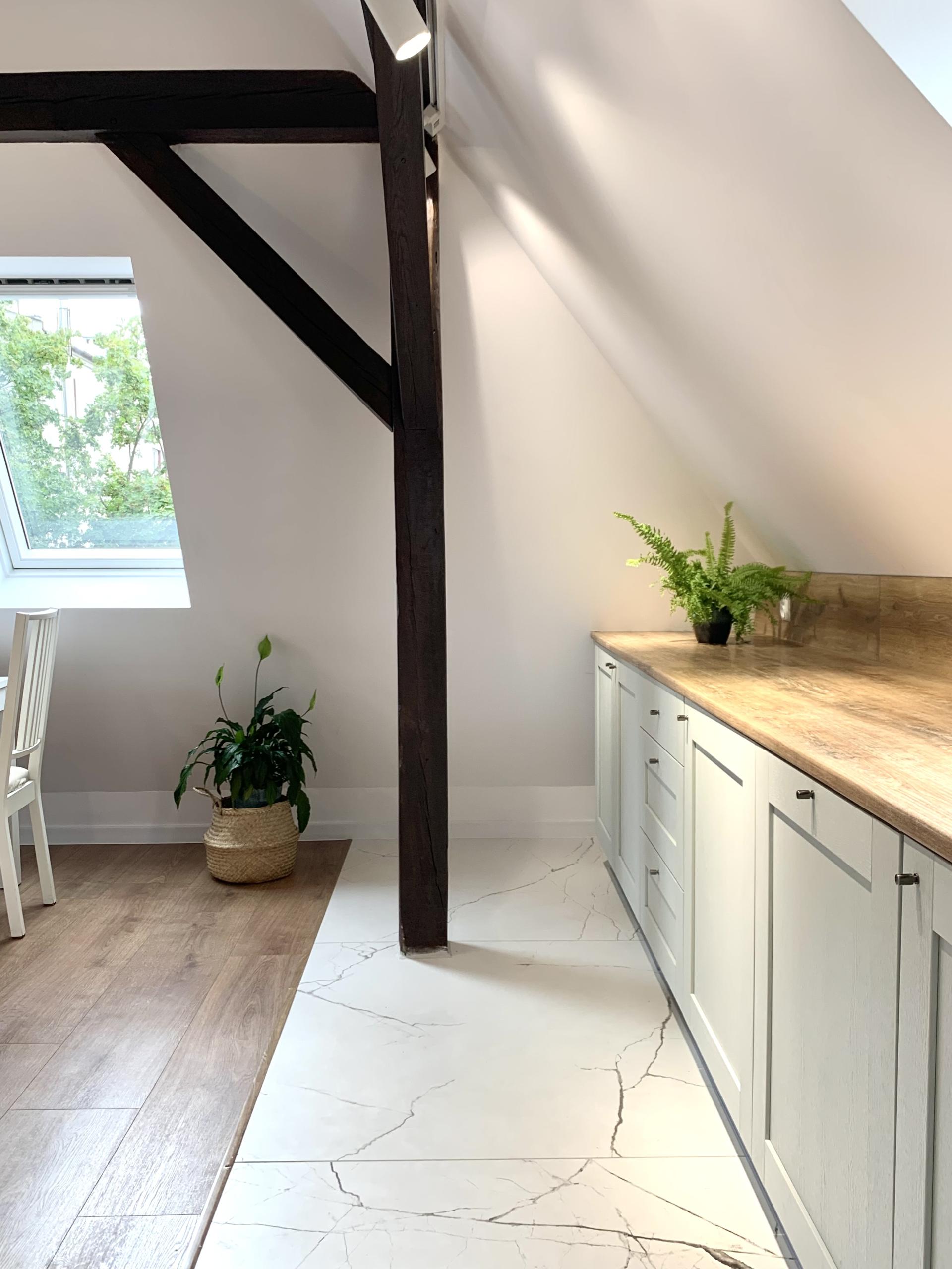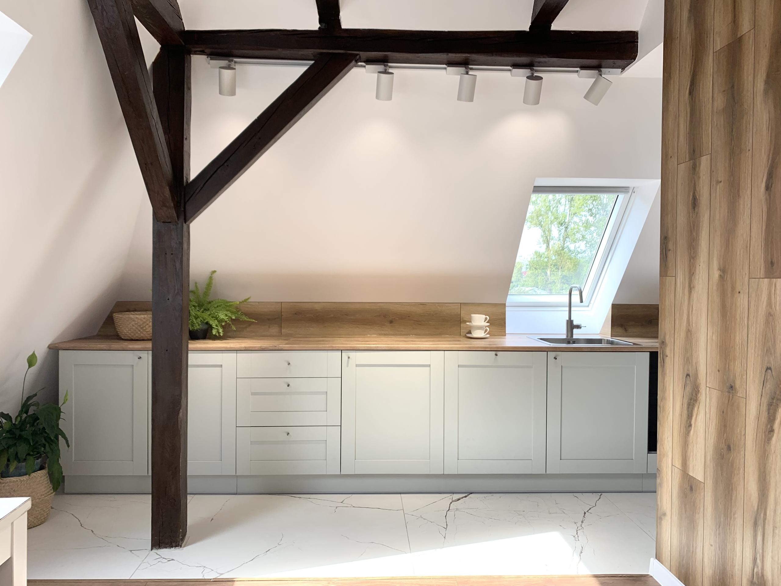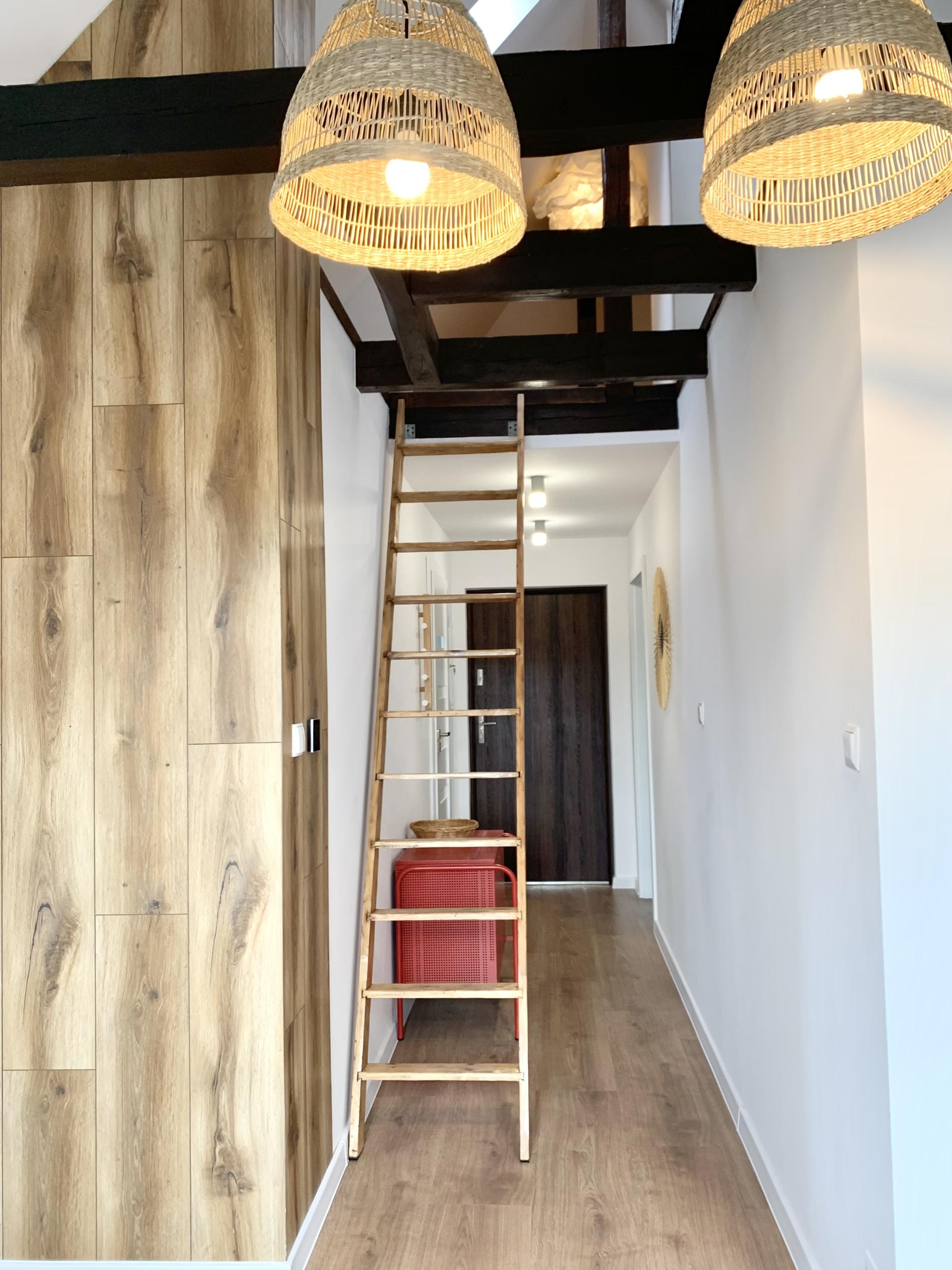 Mieszkanie na poddaszu Słupskiej kamienicy – Klimatyczny apartament przeznaczony na wynajem długoterminowy. W aranżacji skupiłam się na wyeksponowaniu rustykalnych elementów wystroju i połączeniu ich z nowoczesnymi meblami. Natomiast dzięki zmianie układu pomieszczeń i otwarciu przestrzeni powstało funkcjonalne i przestronne wnętrze.